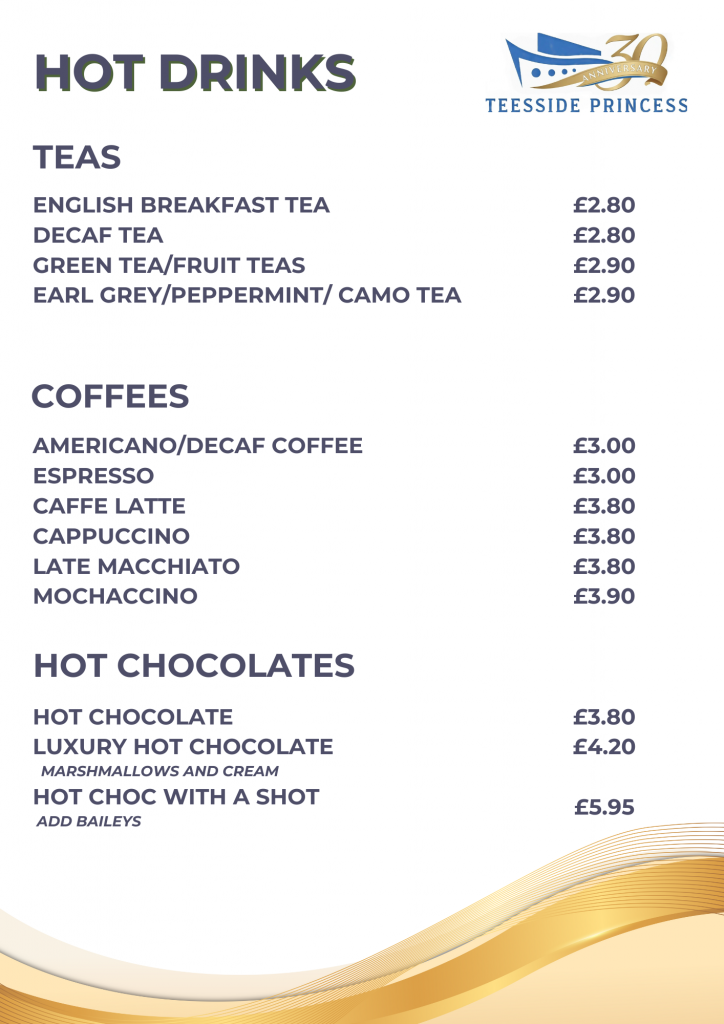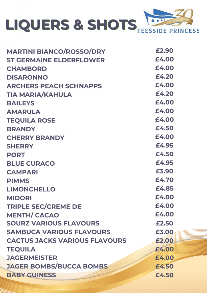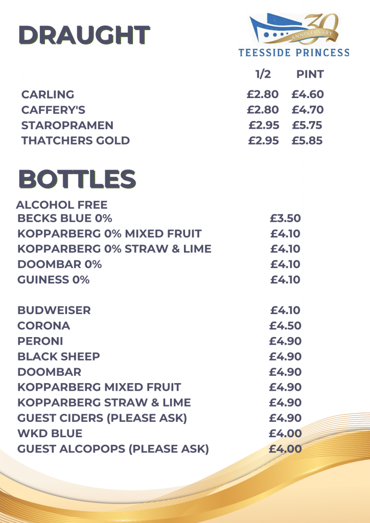Categories Updates Drinks Prices 2026 Post author By TeessidePrincess Post date 4th February 2026 No Comments on Drinks Prices 2026 ← SAILING TIMES Leave a Reply Cancel replyYour email address will not be published. Required fields are marked *Comment * Name * Email * Website